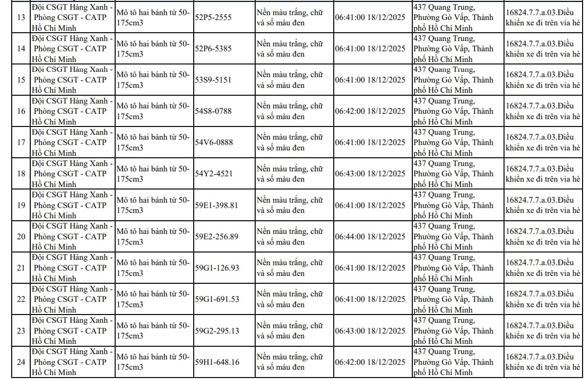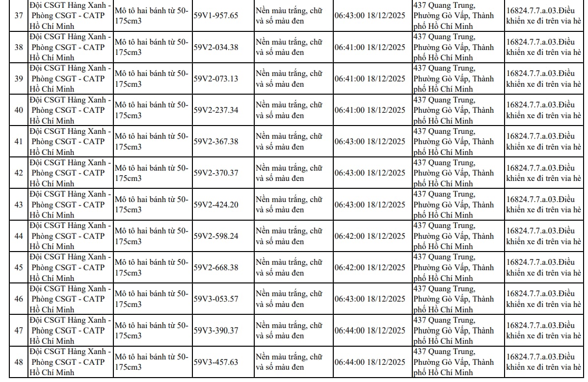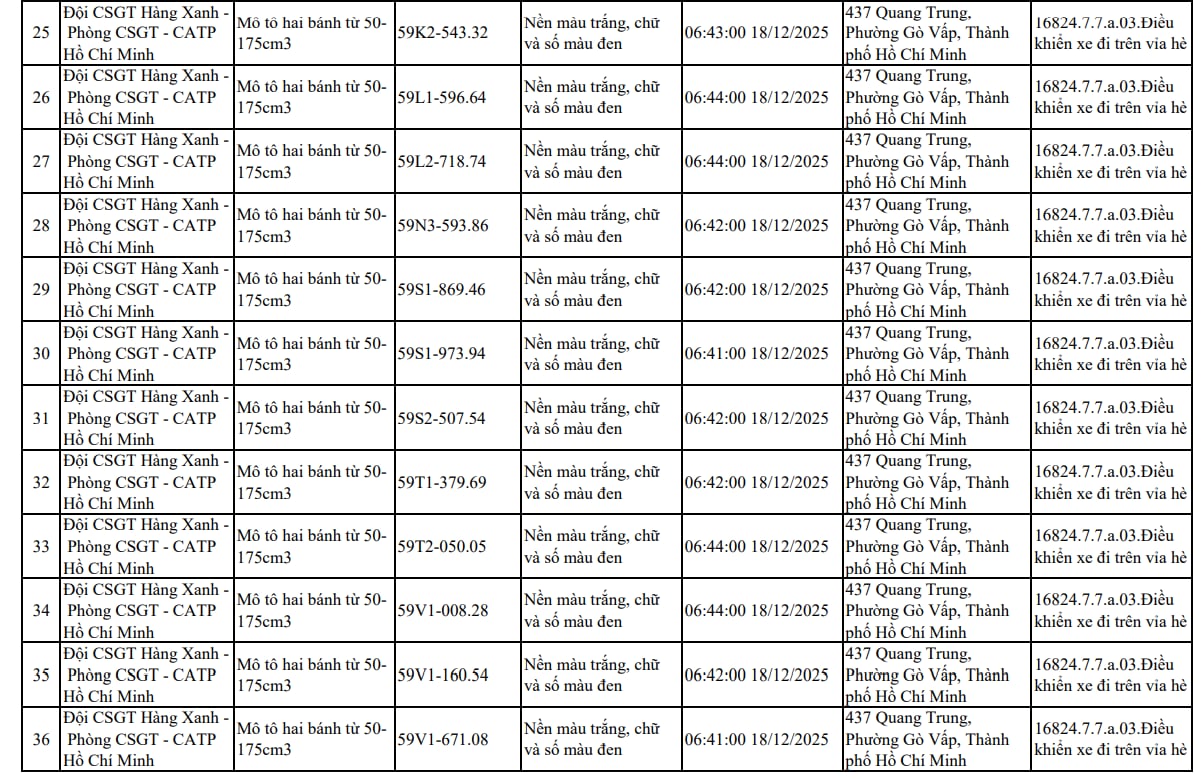 Phòng Cảnh sát Giao thông, Công an TP. Hồ Chí Minh mới đây đã công khai danh sách hơn 100 xe máy đi trên vỉa hè được Đội Cảnh sát Giao thông Hàng Xanh ghi hình, xử phạt trên các tuyến đường thuộc phường Gò Vấp.