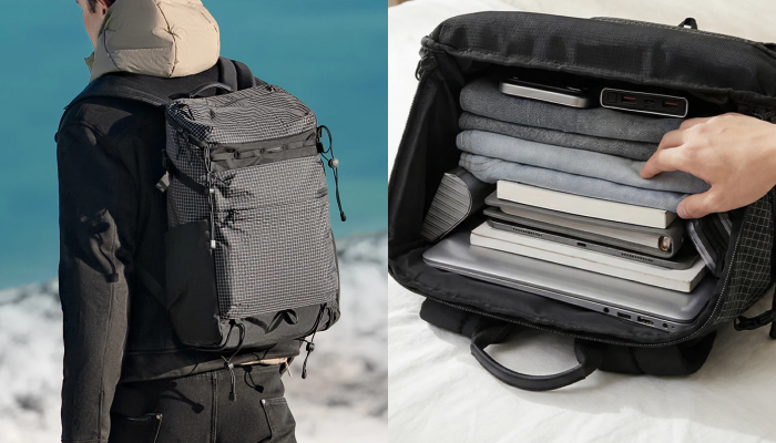 Điểm đáng chú ý nhất là cấu trúc mở 180° kiểu vali. Thiết kế này cho phép sắp xếp đồ theo dạng phẳng, dễ quan sát toàn bộ bên trong thay vì phải lấy, xếp đồ theo kiểu từ trên xuống như balo truyền thống.