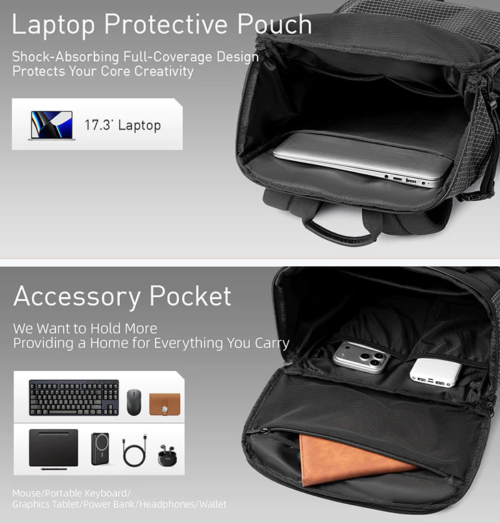 Balo được bố trí nhiều khoang riêng biệt, hỗ trợ sắp xếp thiết bị như sạc, chuột, tai nghe và vật dụng cá nhân một cách rõ ràng. Thiết kế mở giúp truy cập đồ nhanh, phù hợp với người thường xuyên di chuyển hoặc làm việc với nhiều thiết bị.