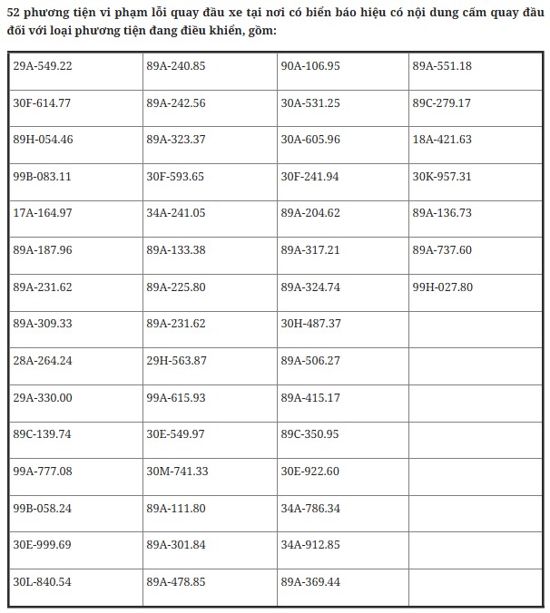 Phòng Cảnh sát giao thông, Công an tỉnh Hưng Yên, từ ngày 23/2 đến ngày 1/3 qua khai thác hệ thống camera giám sát và sử dụng thiết bị nghiệp vụ, lực lượng cảnh sát giao thông đã ghi nhận nhiều phương tiện vi phạm lỗi quay đầu xe tại nơi có biển báo hiệu có nội dung cấm quay đầu như sau: