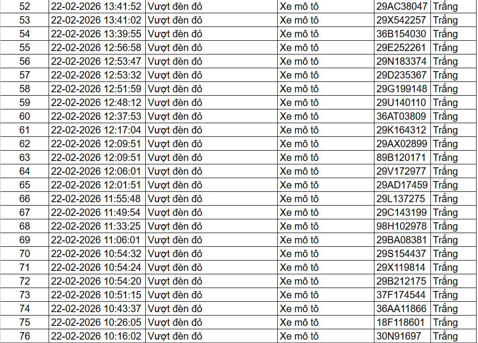 Danh sách được ghi nhận từ ngày 22/2 đến ngày 23/2, với lỗi vi phạm phổ biến là người điều khiển xe mô tô vượt đèn đỏ.