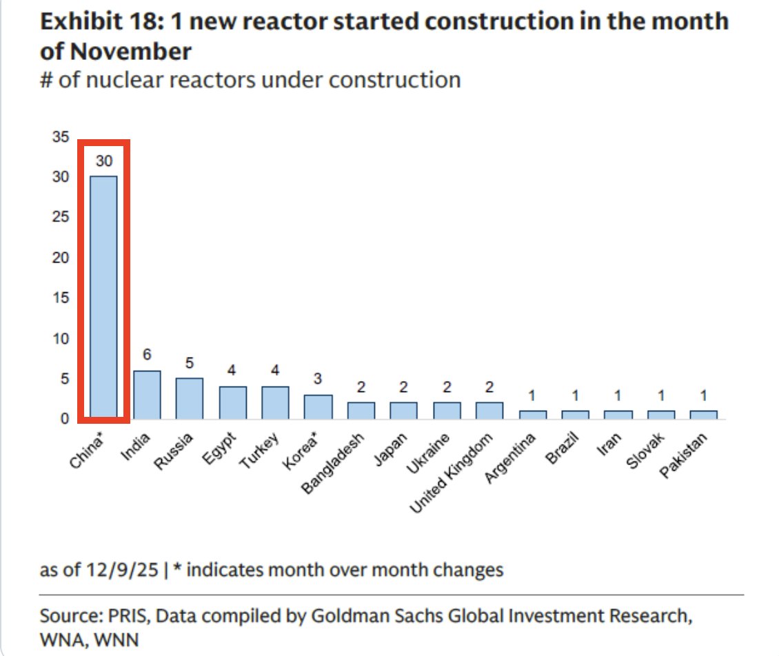 Thống kê vào tháng 12 năm 2025 cho thấy Trung Quốc đang xây đến 30 lò phản ứng hạt nhân mới để sản xuất điện