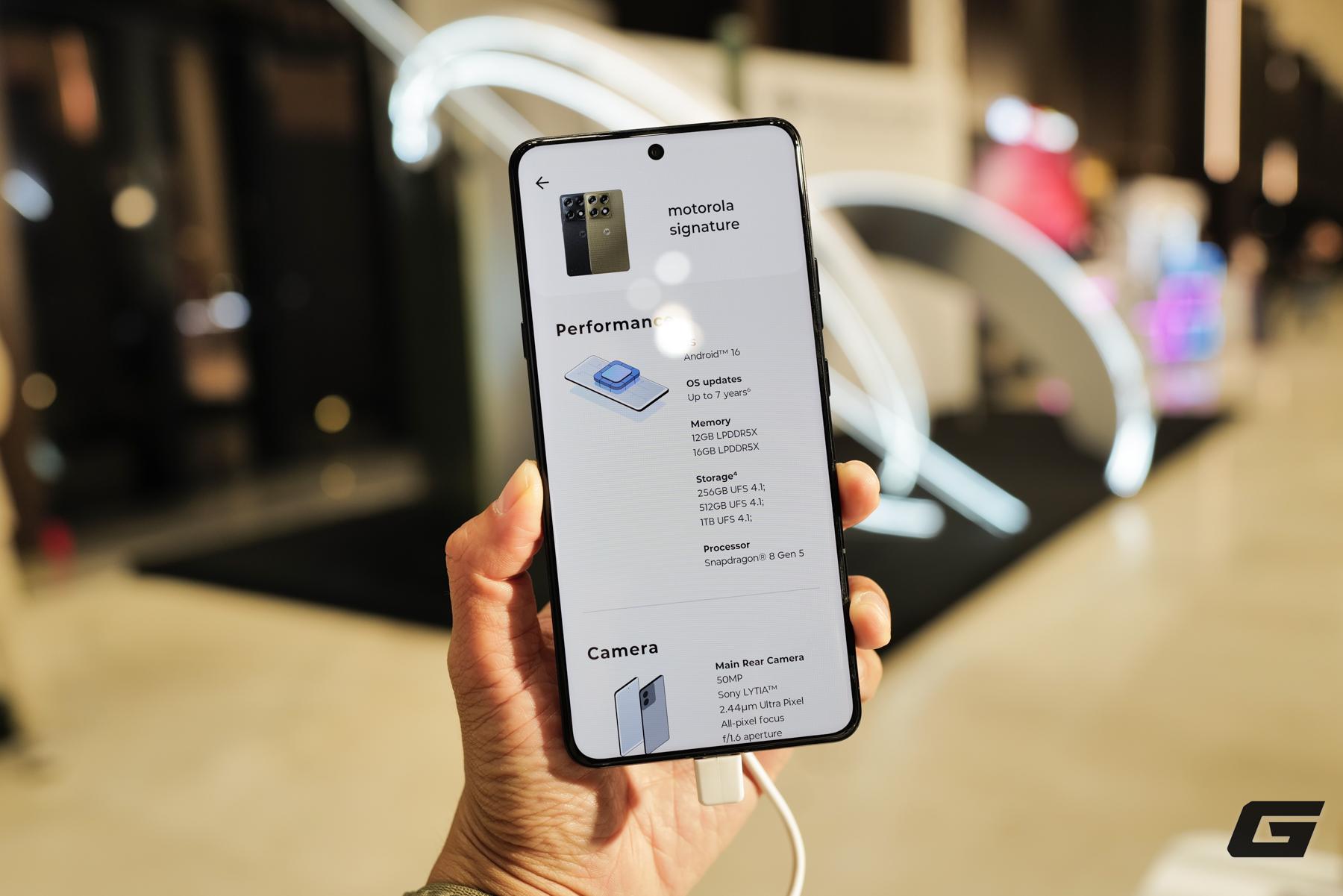 Về hiệu năng, motorola signature được trang bị vi xử lý Snapdragon 8 Gen 5, đi kèm hệ thống tản nhiệt sử dụng gel tản nhiệt kết hợp lưới đồng nhằm duy trì hiệu suất ổn định trong các tác vụ nặng như chơi game hoặc xử lý AI trực tiếp trên thiết bị.