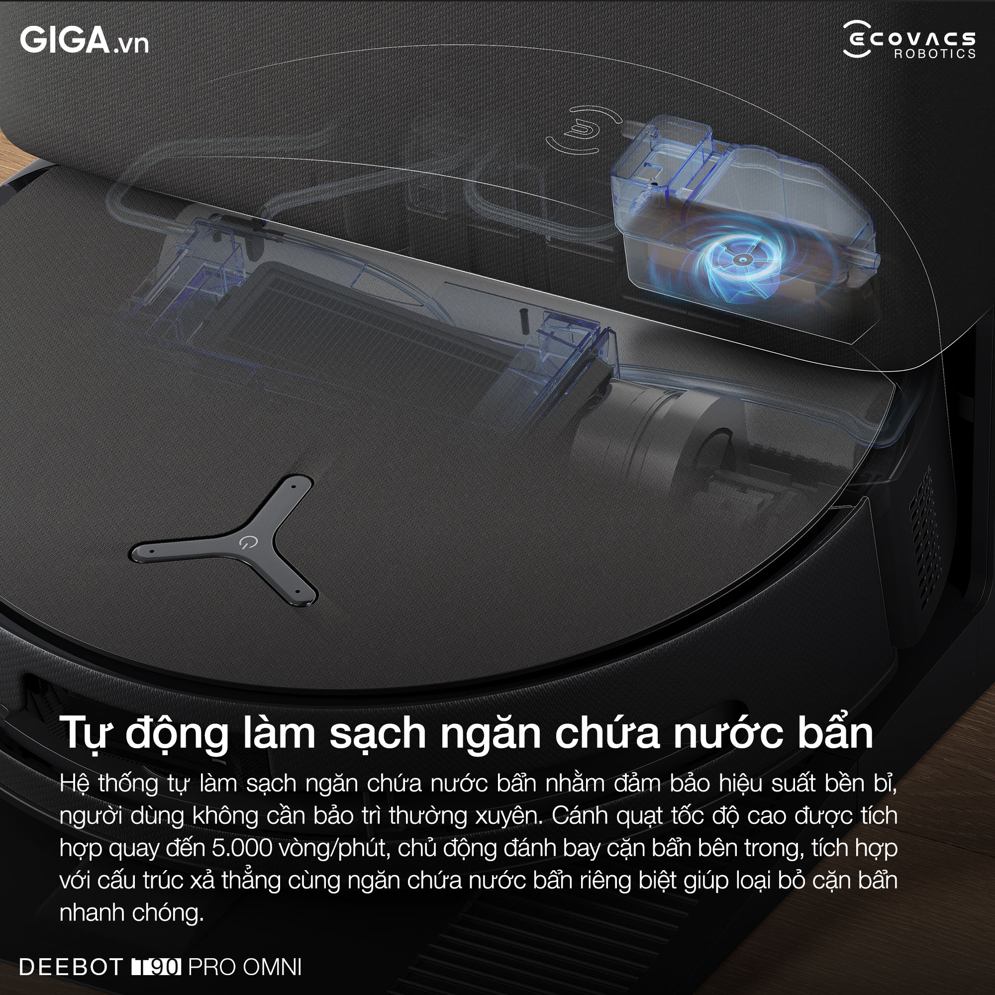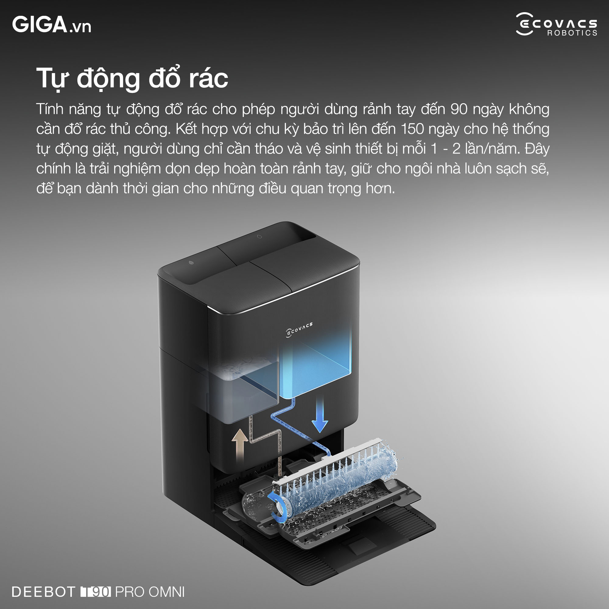 Trạm OMNI của T90 PRO OMNI tích hợp giặt con lăn bằng nước nóng 75°C thông qua hệ thống Fresh Flow Power Washing, tự pha dung dịch làm sạch và tự động đổ rác trong tối đa 90 ngày. Khay giặt con lăn có thể vận hành 150 ngày trước khi cần bảo dưỡng định kỳ.