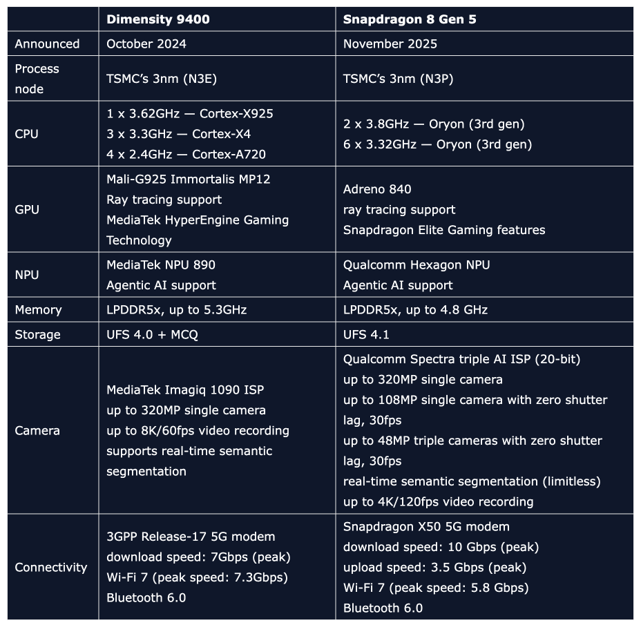 Ở phía đối diện, Qualcomm Snapdragon 8 Gen 5 ra mắt muộn hơn, vào tháng 11/2025, đứng dưới Snapdragon 8 Elite trong danh mục sản phẩm. Chip dùng tiến trình TSMC 3nm N3P mới hơn, với bố cục CPU 2 + 6, bao gồm 2 nhân Oryon thế hệ 3 xung nhịp 3.8GHz và 6 nhân Oryon hiệu năng 3.32GHz. Snapdragon 8 Gen 5 hỗ trợ RAM LPDDR5x tối đa 4.8GHz và lưu trữ UFS 4.1.