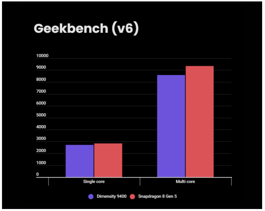 Các bài đo hiệu năng được thực hiện trên Vivo X200 Pro dùng Dimensity 9400 và OnePlus 15R dùng Snapdragon 8 Gen 5. Ở Geekbench, Snapdragon 8 Gen 5 đạt 2.837 điểm đơn nhân và 9.352 điểm đa nhân, cao hơn khoảng 4.5% ở đơn nhân và 9% ở đa nhân so với Dimensity 9400, lần lượt đạt 2.713 và 8.592 điểm.