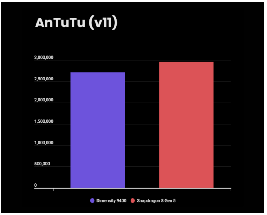 Sang AnTuTu, Snapdragon 8 Gen 5 đạt tổng điểm gần 3.000.000, trong khi Dimensity 9400 dừng ở khoảng 2.7 triệu điểm. Mức chênh lệch vào khoảng 9%. Snapdragon vượt lên ở mọi hạng mục, từ CPU cao hơn khoảng 7%, GPU cao hơn khoảng 5%, cho tới bộ nhớ và trải nghiệm UX.