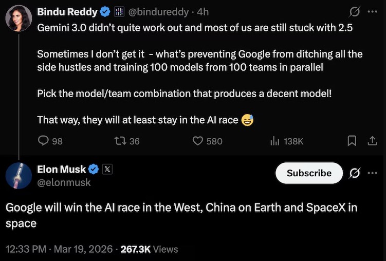 Nữ CEO gợi ý rằng Google nên chạy các thử nghiệm song song và đào tạo nhiều mô hình cùng lúc thay vì phân mảnh nguồn lực vào quá nhiều dự án tách biệt. Ngay dưới bài đăng này, Elon Musk đã để lại một bình luận mang tính đúc kết cục diện, khẳng định Google sẽ giành phần thắng trong cuộc đua AI ở phương Tây, nhưng Trung Quốc sẽ chiếm thế thượng phong trên toàn cầu, và không gian là lãnh địa của SpaceX.