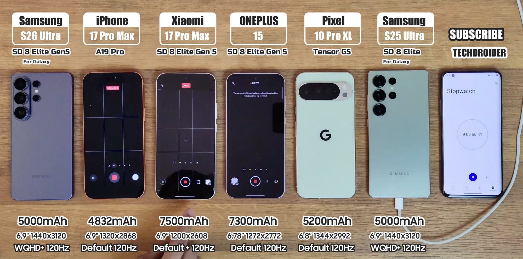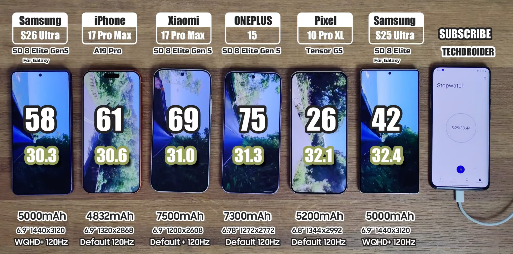 Các vị trí phía trên lần lượt thuộc về iPhone 17 Pro Max với 9 giờ 41 phút, Xiaomi 17 Pro Max với 10 giờ 03 phút và OnePlus 15 dẫn đầu với 12 giờ 31 phút. Đáng chú ý, Galaxy S25 Ultra năm ngoái đạt 8 giờ 40 phút, nằm giữa Pixel 10 Pro XL và S26 Ultra trong cùng phép thử.