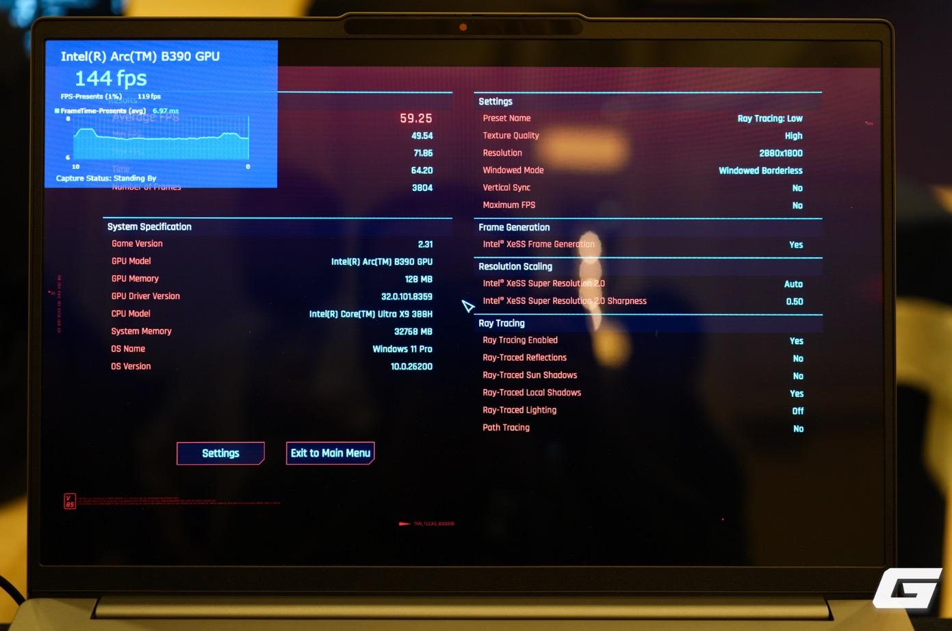 Trong số đó có Cyberpunk 2077, một tựa game vốn nổi tiếng đòi hỏi phần cứng mạnh. Ở độ phân giải Full HD với thiết lập Ray Tracing, kết hợp công nghệ XeSS và Frame Generation, hệ thống có thể đạt mức khung hình xấp xỉ 100 FPS trong điều kiện trình diễn.