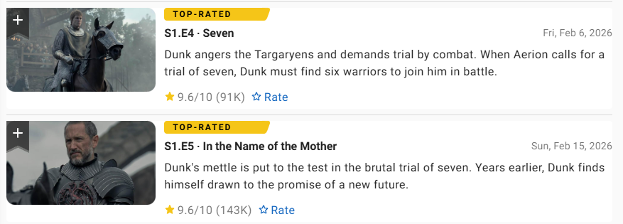 Hai tập phim có điểm số cao nhất trong mùa đầu tiên của A Knight of the Seven Kingdoms.