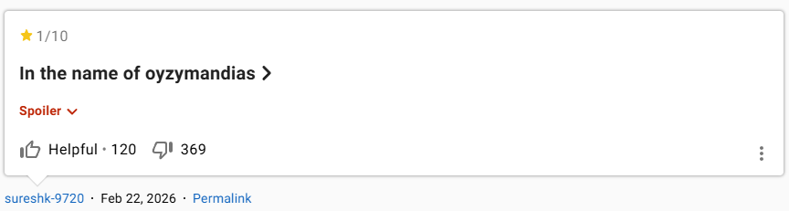 "Trả thù cho A Knight of the Seven Kingdoms": người dùng này khẳng định Ozymandias rất xuất sắc nhưng vì hành vi xấu của fan Breaking Bad mà người này đánh giá 1 sao.