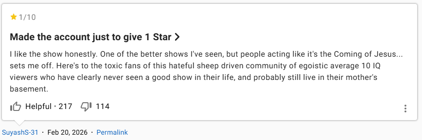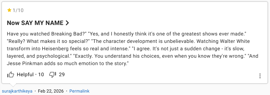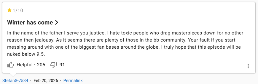 Bên cạnh thói quen chấm điểm cao cho tập phim yêu thích, fan Breaking Bad còn một … tật xấu nữa: chấm điểm thấp cho những tác phẩm truyền hình có khả năng chiếm lấy cái ngai vàng 10/10. Rất nhiều bộ phim đã trở thành “nạn nhân” của những chiến dịch chấm điểm thấp, hay “review bomb”: đám đông “fan cuồng” của Breaking Bad cố tình chấm 1 sao cho các tập phim đủ hay, có tiềm năng lấy mất vị trí điểm tuyệt đối của Ozymandias.