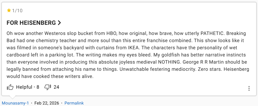 Tập thứ tư và tập thứ năm của series A Knight of the Seven Kingdoms, mang tên Seven và In the Name of the Mother, được đánh giá rất cao, thậm chí đã có lúc chạm tới con số 10 tuyệt đối. Nhưng “con gà tức nhau tiếng gáy”, hàng loạt người cuồng mộ Breaking Bad đã tràn vào đánh giá 1 sao cho hai tập phim trên. Ở thời điểm bài viết này được thực hiện, hai tập phim đang có cùng điểm số 9,6/10.
