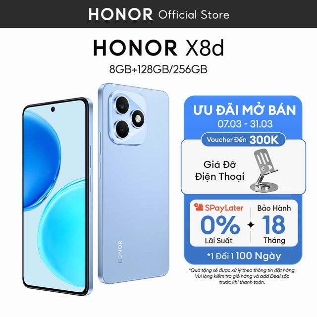HONOR chính thức đưa X8d lên kệ tại Việt Nam từ ngày 07/03/2026, giá niêm yết từ 8,09 triệu đồng cho bản 8 GB/128 GB và 8 GB/256 GB. Ba màu gồm Xanh Thiên Vân, Xám Nguyệt Quang và Đen Huyền Bí. Trong các ngày sale Shopee 10 hoặc 15/3, giá dự kiến còn khoảng 8 triệu đồng, kèm giá đỡ điện thoại và bảo hành 18 tháng.