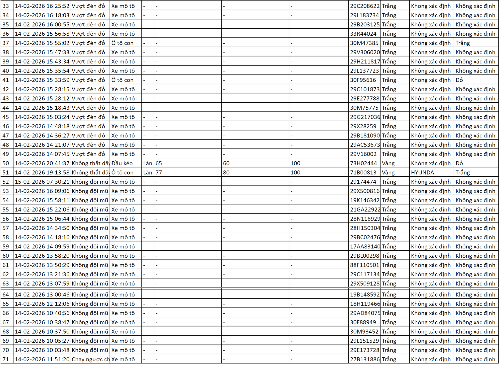 Trong ngày 15/2/2026, Cục Cảnh sát giao thông đã xác định thêm nhiều trường hợp vi phạm trật tự an toàn giao thông qua hệ thống camera A.I.