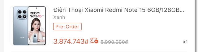 Trong thời gian mở đặt trước, REDMI Note 15 bản "quốc dân" sale còn 3,8 triệu đồng, mức giá tương đương giá của phiên bản năm ngoái. Bạn đọc có thể tham khảo giá bán sản phẩm Shopee Mall hoặc Lazada Mall.