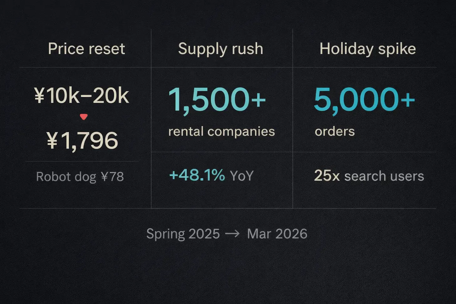 Một nhà phân tích của Trung Quốc dự báo quy mô thị trường cho thuê sẽ đạt 10 tỷ nhân dân tệ trong năm 2026, tăng gấp 10 lần so với mức dưới 1 tỷ hiện tại. Tết Nguyên Đán 2026 đã chứng minh dự báo này không phải là không có cơ sở: Qingtian Rent báo cáo đơn hàng tăng vọt 70% trong tuần lễ, với tổng số đơn vượt 5.000. Còn trên JD.com, lượng người tìm kiếm sản phẩm liên quan đến robot tăng tới 25 lần so với cùng kỳ năm ngoái.