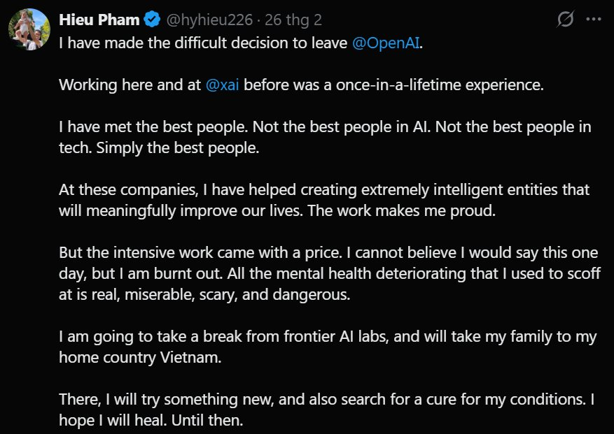 Thông qua tài khoản cá nhân trên nền tảng mạng xã hội X, Phạm Hy Hiếu chia sẻ quyết định rời đi của anh xuất phát từ tình trạng kiệt sức do áp lực công việc kéo dài dẫn đến những vấn đề nghiêm trọng về sức khỏe tinh thần. Do đó, anh đã dừng lại hành trình ở OpenAI, cùng gia đình trở về Việt Nam để điều trị sức khỏe, đồng thời khám phá những hướng đi mới.