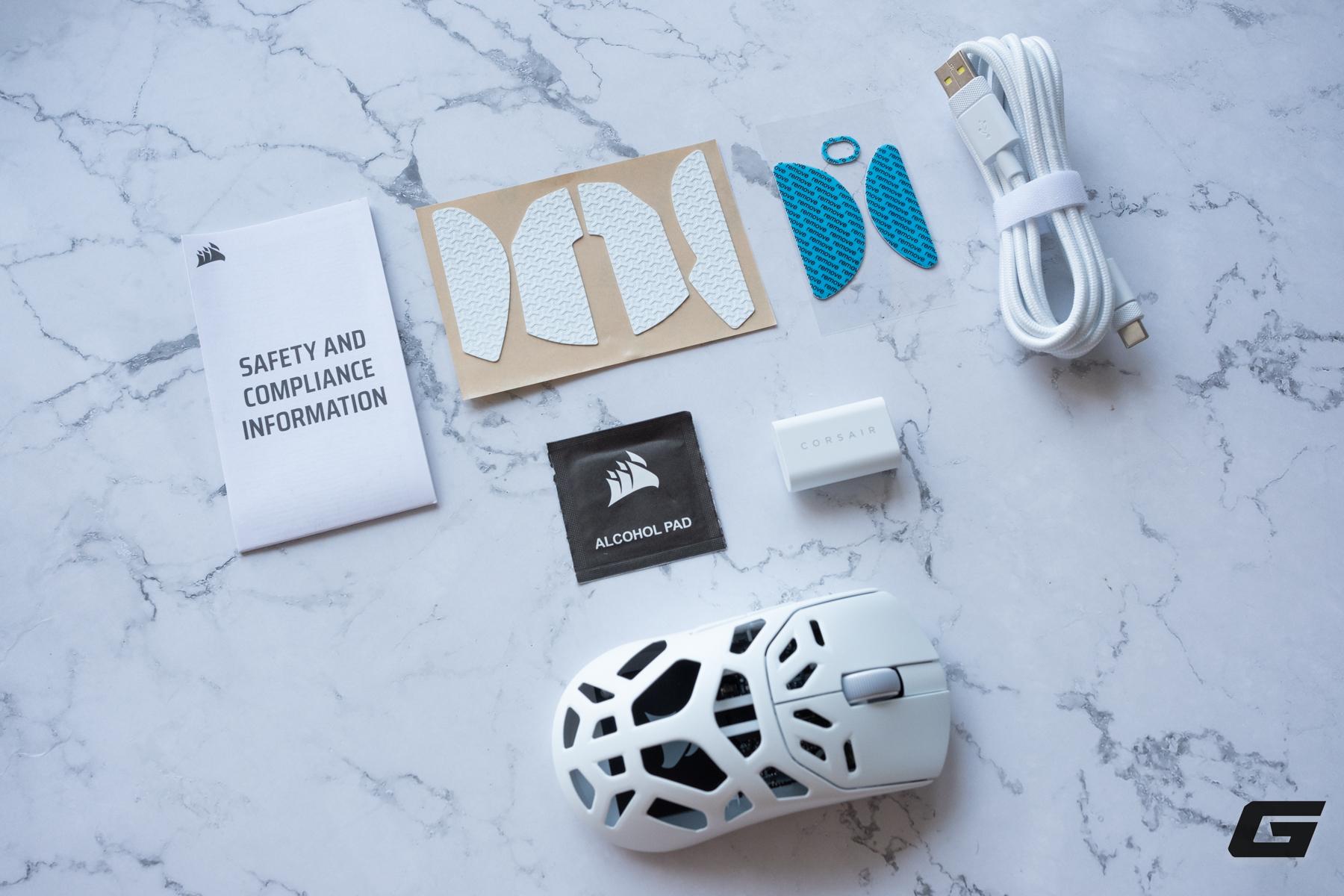 Điểm đáng giá tiếp theo trong bộ phụ kiện này phải kể đến bộ grip tape được cắt sẵn theo khuôn chuột, đi kèm một gói khăn tẩm cồn để người dùng vệ sinh bề mặt trước khi dán. Đây là trang bị cực kỳ hữu ích cho những game thủ hay ra mồ hôi tay hoặc cần cảm giác cầm nắm chắc chắn tối đa trong những pha vẩy tâm tốc độ cao. Chưa dừng lại ở đó, hãng cũng hào phóng tặng kèm thêm một bộ feet chuột thay thế. Chi tiết nhỏ này cho thấy sự thấu hiểu game thủ của Corsair, giúp người dùng yên tâm "cày ải" trong thời gian dài mà không lo ngại vấn đề hao mòn làm giảm độ mượt mà khi di chuột.