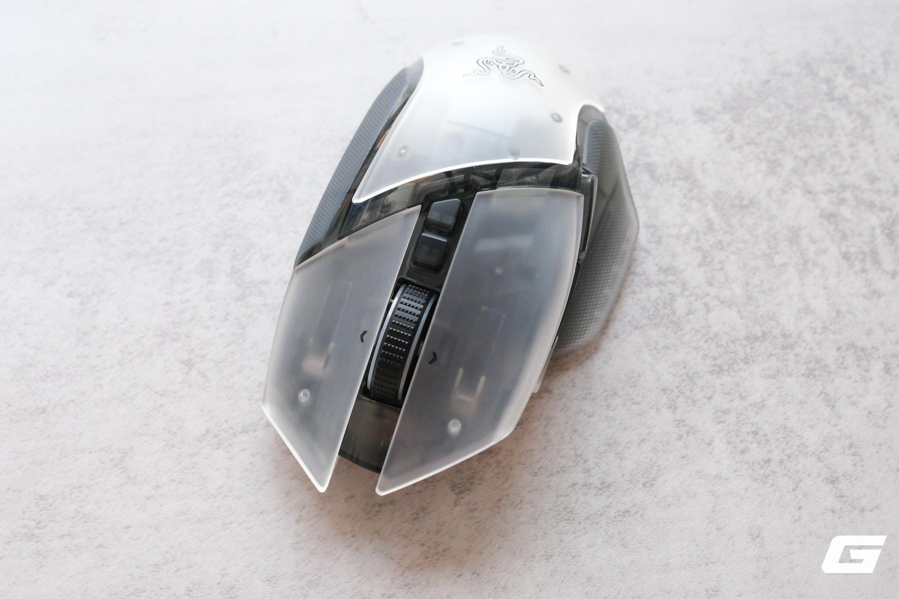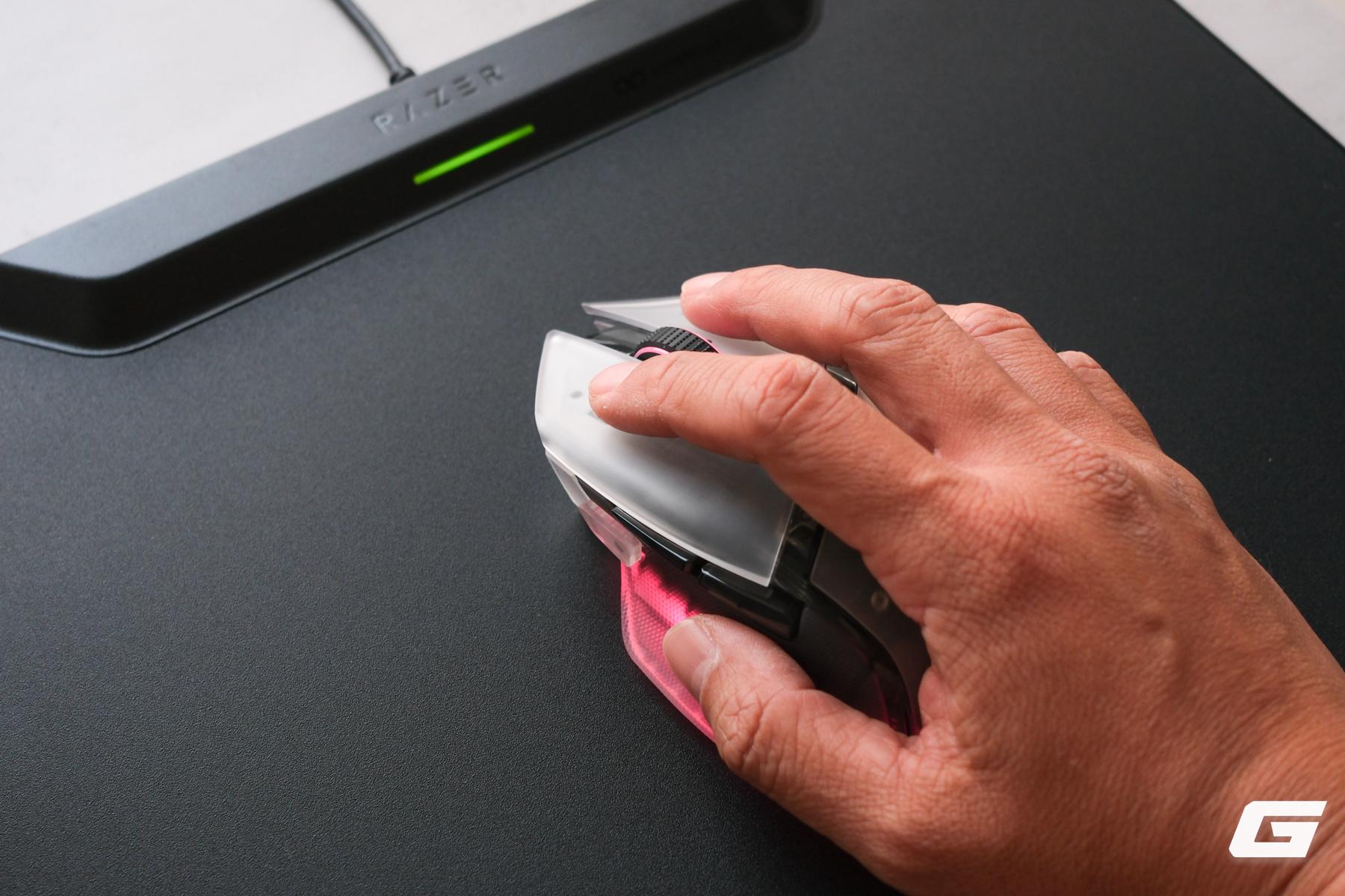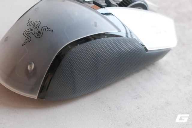 Phần hông chuột là một sự kết hợp thú vị về thị giác và xúc giác: lớp vỏ nền vẫn là chất liệu bán trong suốt, nhưng được phủ lên một lớp đệm grip cao su màu xám khói, giúp hạn chế tình trạng ố vàng sau thời gian dài sử dụng.