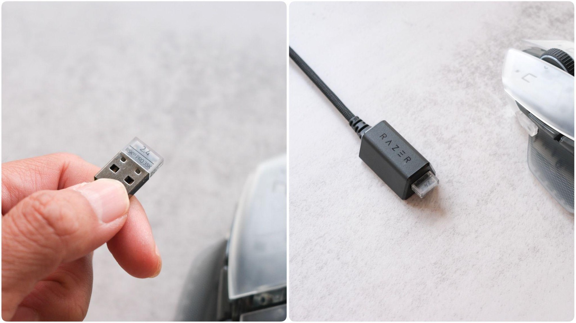 Razer tỉ mỉ đến mức làm luôn cả chiếc USB Dongle đi kèm và Adapter bằng màu Phantom White tông xuyệt tông, một chi tiết nhỏ nhưng cho thấy sự chỉn chu của hãng trong phiên bản cao cấp này.