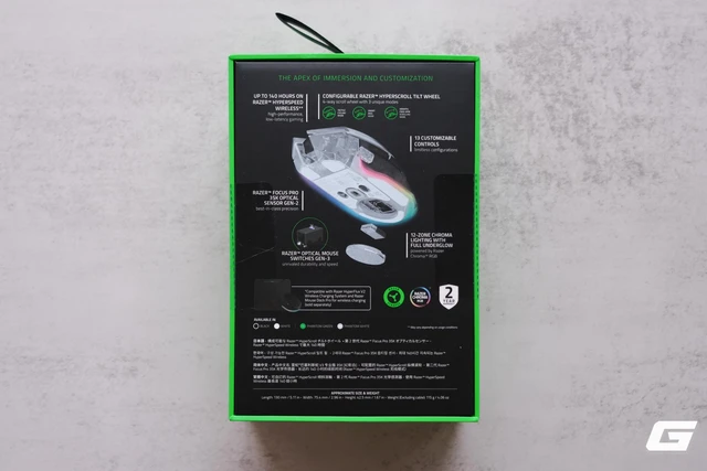 Nổi bật nhất là dòng chữ nhấn mạnh thời lượng pin lên tới 140 giờ, cảm biến quang học Focus Pro 35K Gen-2 mới nhất và switch quang học Gen-3. Cơ chế con lăn HyperScroll Tilt Wheel độc quyền với 3 chế độ lăn (Tactile, Smart-Reel, Free-Spin) cũng được mô tả rõ ràng bằng hình ảnh minh họa. Nhìn chung thì các tính năng đều giống với bản Razer Basilisk V3 Pro 35K tiêu chuẩn thôi, nhưng điểm "ăn tiền" ở phiên bản này tất nhiên sẽ nằm ở lớp vỏ.