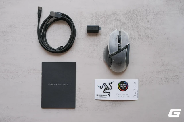 Bộ phụ kiện đi kèm vẫn giữ đúng truyền thống hào phóng của Razer, bao gồm sách hướng dẫn sử dụng, bộ sticker Chroma RGB, sợi cáp sạc bọc dù. Tuy nhiên, sự đồng bộ của Razer lại thể hiện rõ nhất ở những chi tiết nhỏ xíu mà ít hãng nào để ý.
