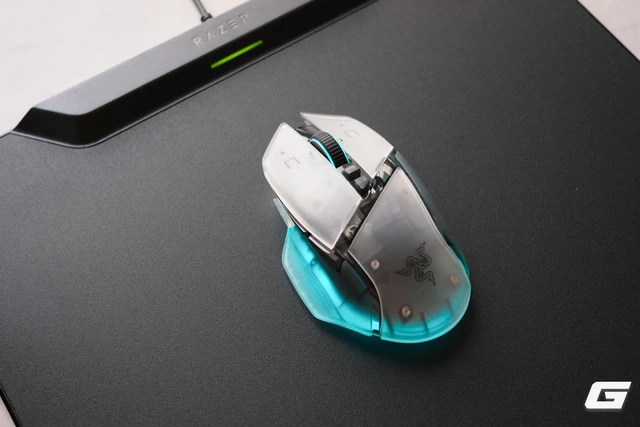Nếu chỉ nhìn thoáng qua, bạn sẽ nghĩ đây đơn thuần là một chiếc đế sạc không dây nam châm giúp góc chơi game gọn gàng hơn. Cơ chế hoạt động khá đơn giản: bạn thay thế nắp tròn bảo vệ ở mặt dưới chuột bằng "Wireless Charging Puck" đi kèm. Từ đó, mỗi khi ngừng sử dụng, chỉ cần thả nhẹ chuột lên đế, lực từ tính sẽ tự động hút và giữ chuột ở đúng vị trí sạc, loại bỏ hoàn toàn thao tác cắm dây USB-C thủ công mỗi ngày. Tất nhiên chúng ta cũng có thể tuỳ chỉnh các hiệu ứng đèn RGB của dock sạc trong phần mềm Synapse.