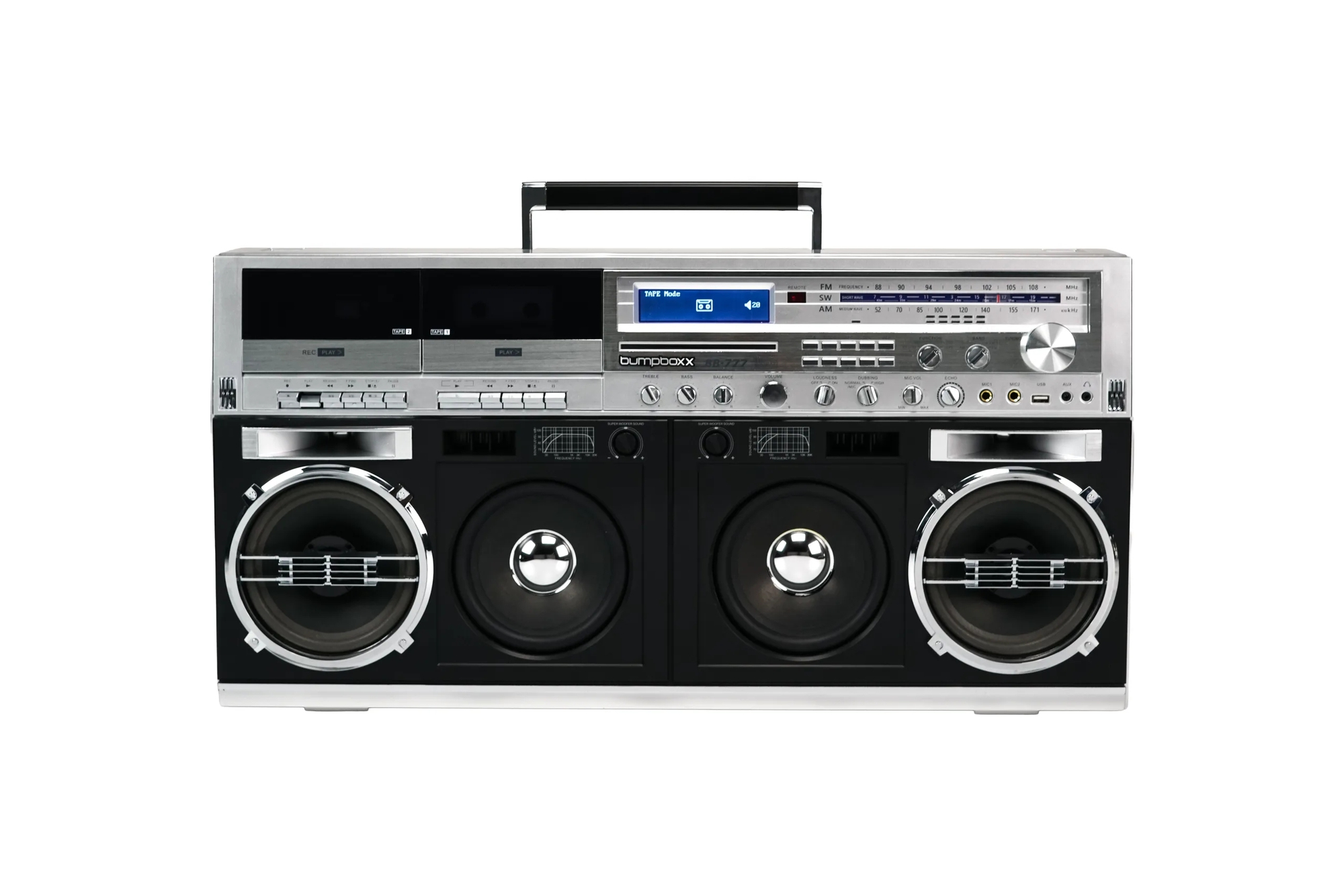 Bumpboxx vừa ra mắt BB-777, chiếc boombox di động mang phong cách thập niên 80 nhưng tích hợp đủ các định dạng từ cassette, CD, radio đến Bluetooth, công suất 270W và pin chơi được 15 tiếng liên tục.