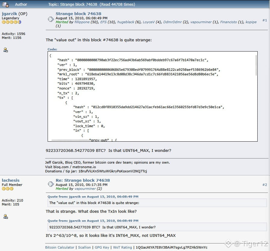 Vào tháng 8 năm 2010, mã nguồn của Bitcoin bị một hacker giấu tên khai thác lỗi. Block 74.638 xuất hiện, block định mệnh tạo ra 184.467.440.737,09551616 Bitcoin, với hai địa chỉ nhận mỗi địa chỉ hơn 92 tỷ Bitcoin, chính xác là 92.233.720.368 Bitcoin. Con số này gấp hàng nghìn lần tổng nguồn cung Bitcoin được thiết kế.