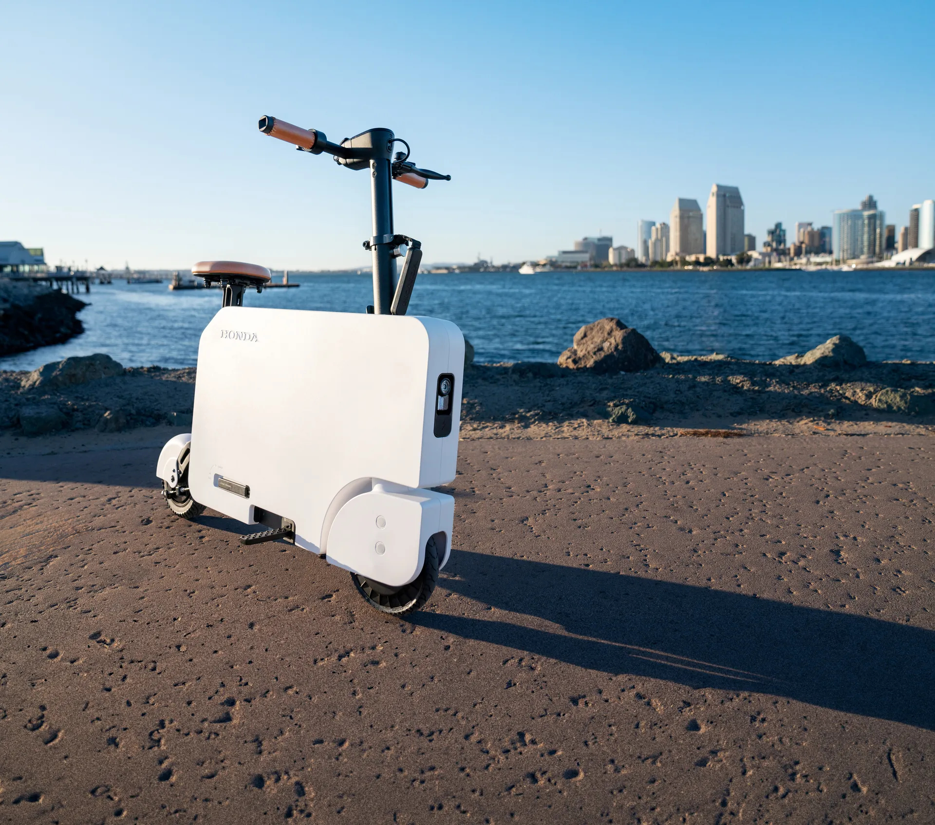 Chỉ trong khoảng 30 giây, chiếc xe có thể được gập gọn hoàn toàn thành một khối hình chữ nhật với kích thước 741 x 535 x 94 mm, trông như một chiếc vali có tay xách và bánh xe để kéo đi. Nhờ đó, người dùng có thể dễ dàng mang xe vào văn phòng, lớp học hoặc cất gọn trong cốp ô tô. (Ảnh: Honda of Sumner)