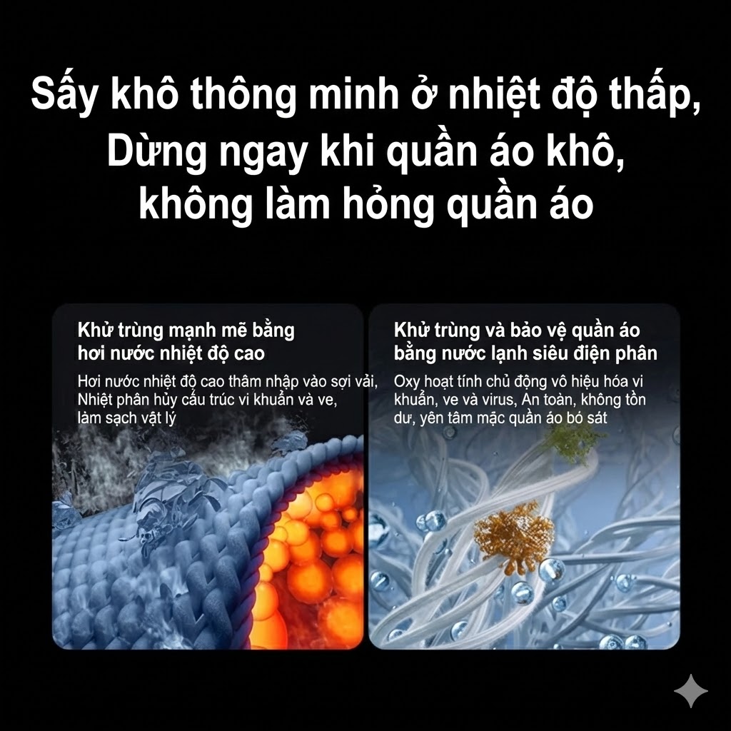 Máy cũng hỗ trợ khử trùng kép bằng hơi nước nhiệt độ cao kết hợp điện phân nước lạnh. Dữ liệu thử nghiệm cho thấy tỷ lệ loại bỏ vi khuẩn đạt 99.999%, virus 99.999% và loại bỏ mạt bụi đạt 100%. Cách tiếp cận này được Xiaomi nhấn mạnh là phù hợp với quần áo trẻ em và đồ lót.