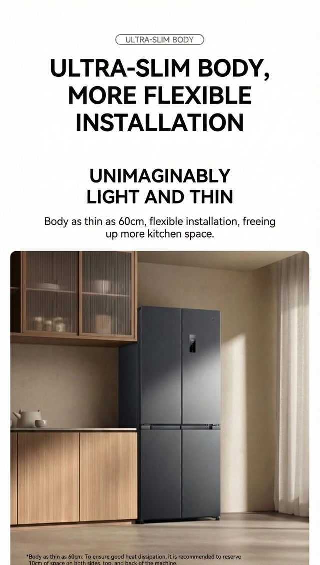 Tủ lạnh Mijia 430L có dung tích ngăn lạnh 251 lít và ngăn đông 154 lít, cho phép người dùng thoải mái lưu trữ thực phẩm. Đặc biệt, tủ chỉ chiếm diện tích 0,45m², phù hợp với các căn bếp mở hoặc căn hộ nhỏ.