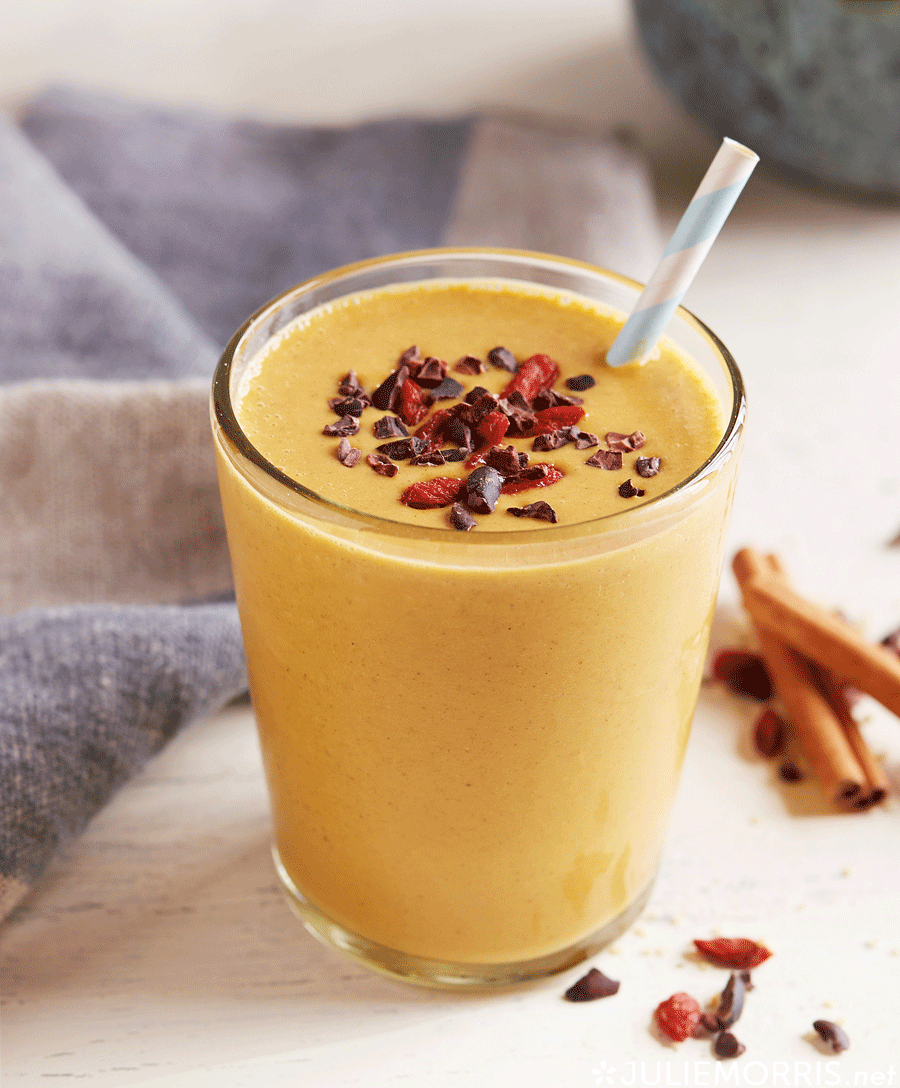Cho vào máy xay sinh tố: ½ chén bí ngô đóng hộp (hoặc bí ngô tươi luộc chín xay nhuyễn), 198 gam sữa chua Hy Lạp 2%, ½ chén nước, ¼ chén quả bơ, 2 muỗng canh hạt lanh, 1 muỗng canh sirô cây phong, ½ muỗng cà phê gia vị bánh bí ngô. Trộn đều cho đến khi hỗn hợp mịn và trở thành sinh tố.