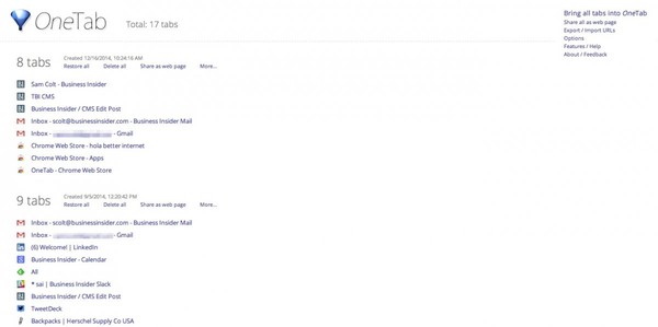 OneTab là ứng dụng không thể thiếu với những ai thường xuyên phải mở quá nhiều tab. Theo đó, OneTab sẽ biến các tab bạn mở thành dạng một danh sách theo ngày, từ đó giúp bạn không cần mở nhiều tab nhưng vẫn không quên danh sách các website mà mình cần truy cập.