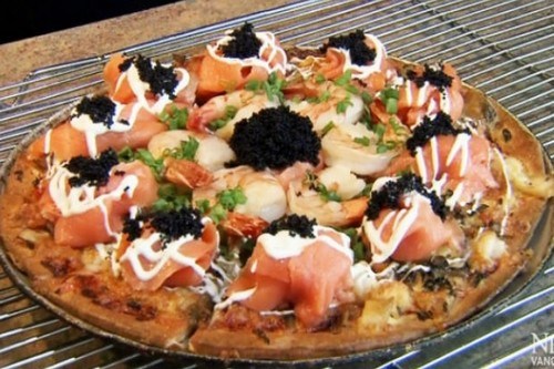 Chiếc bánh pizza đắt nhất thế giới được bán tại chuỗi cửa hàng của Nino’s Bellissima Pizza tại New York. Các thành phần của chiếc bánh pizza này bao gồm: sốt cream fish, lá hẹ và hành tây, 4 loại trứng cá đen muối khác nhau của Petrossian, tôm hùm Atlantic, cá hồi, chút wasabi và 1 vài hương liệu khác.