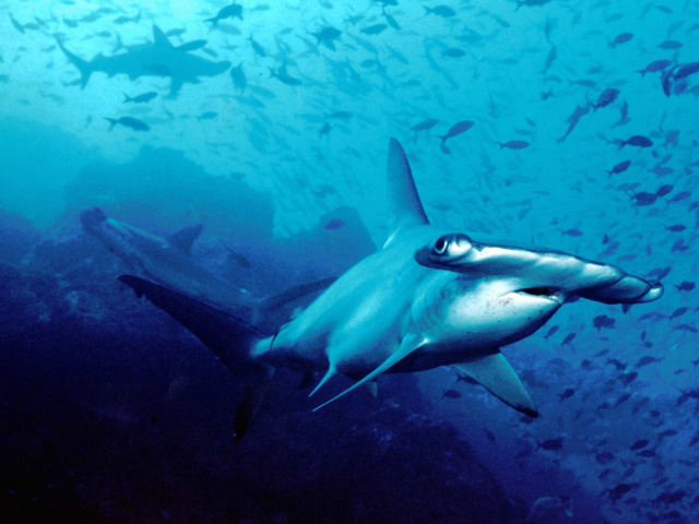 3. Cá mập đầu búa: Đừng đùa với đầu búa! Chúng có thể dài đến 6m và có góc nhìn 360 độ. Hãy thử tưởng tượng cảnh chăn gối của chúng: “Đầu búa đực sẽ cắn con cái một cách đầy bạo lực cho đến khi nó đồng ý.” Chúng cũng cắn người luôn.