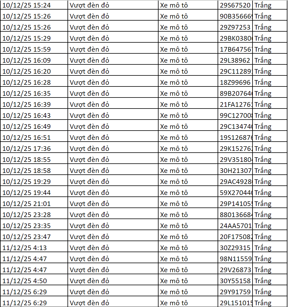 Ngoài ra, lực lượng chức năng ghi nhận 60 trường hợp vi phạm lỗi không chấp hành hiệu lệnh của đèn tín hiệu giao thông (vượt đèn đỏ). Danh sách biển số vi phạm gồm: