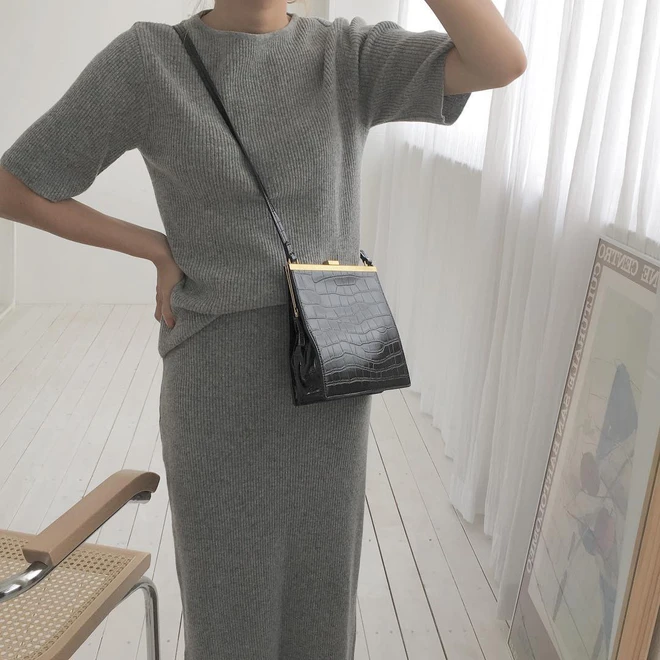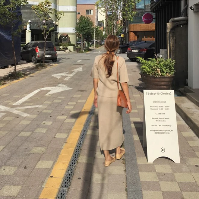 Nếu như mùa hè vừa qua, set váy chất liệu thô đũi lên ngôi thì mùa lạnh này, vị trí đó được thay thế bằng phiên bản ấm áp hơn: set váy len. Có sẵn một set váy kiểu này trong tủ đồ, bạn sẽ chẳng cần phải lo mix&match nữa, chỉ cần xỏ thêm giày, đeo thêm túi, trời lạnh hơn thì khoác thêm áo nữa là xinh đẹp tinh tươm rồi. Ở thời điểm hiện tại, set váy len đang được ưa thích nhất bao gồm áo cộc tay và chân váy dài trên mắt cá với những gam màu trung tính nhẹ nhàng như be, nâu ghi, kem, ghi...
