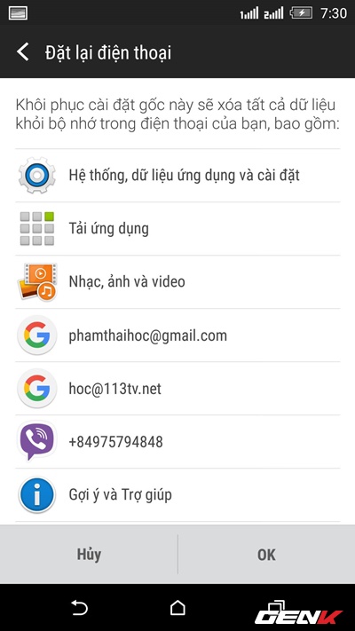 Cuối cùng, bạn hãy xem lại các thông tin mà Android sẽ xóa khi tiến hành cài đặt lại điện thoại. Khi đã chắc chắn, bạn hãy nhấn OK để bắt đầu.
