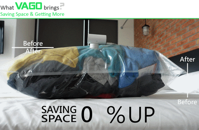Ý tưởng này rất đơn giản: chúng ta cho quần áo vào trong một bao gói đặc biệt, kết nối với VAGO để hút không khí ra, nhờ đó làm giảm không gian bị chiếm dụng. VAGO hoạt động nhờ pin tích hợp và được sạc qua cổng USB chung với điện thoại. Quả thật quá tiện lợi phải không nào!
