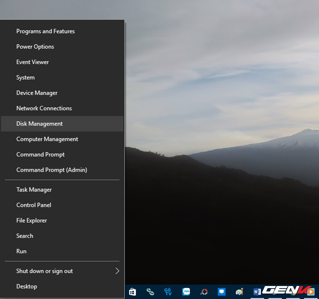 Nhấn phải chuột vào nút Start và chọn lệnh Disk Management.