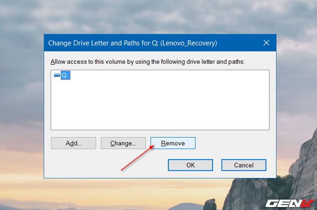 Hộp thoại Change Partition Letter and Paths của phân vùng bạn chọn sẽ xuất hiện, hãy nhấn Remove.