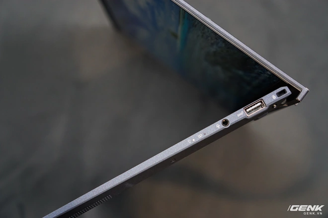 Khu vực màn hình dày hơn so với bàn phím vì dồn gần như toàn bộ linh kiện máy vào đây. Cổng cắm Thunderbolt 3.0 cũng được đặt ở phía trên. Bản lề cũng hở ra 1 khoảng, đây chính là chỗ để hệ thống tản nhiệt của máy hoạt động.
