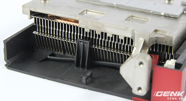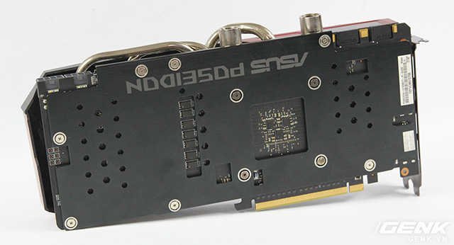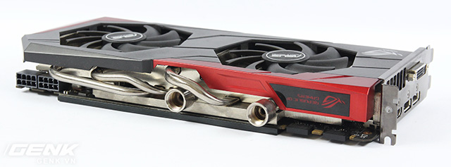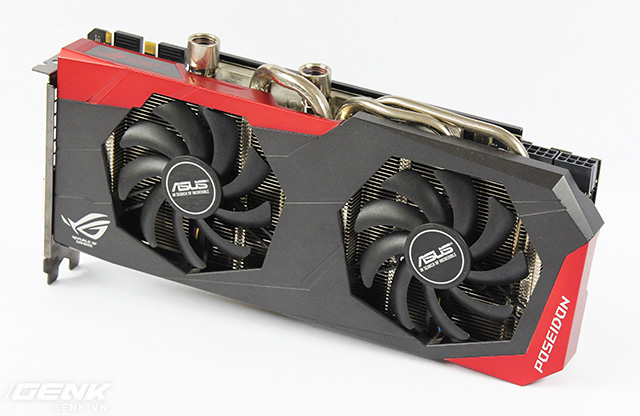 Nếu chỉ có thế, Poseidon hẳn là một sản phẩm đơn điệu, đặc biệt ở phân khúc cao cấp người dùng luôn đòi hỏi điểm nhấn. Tất nhiên không hãng nào làm ra một chiếc GTX 980 Ti như thế, và Asus cũng không phải ngoại lệ. Điểm lạ khiến người dùng chú ý ngay lập tức là 2 cái “sừng” mọc ra khỏi cạnh trên của card. Đây chính là 2 ống dẫn thông tới đế làm mát bên dưới, nằm chờ sẵn cho ai thích độ thêm tản nhiệt nước.