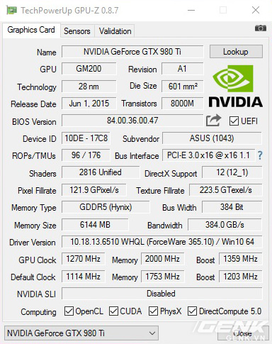 Chip nhớ do SKhynix cung cấp. GTX 980 Ti có dung lượng bộ nhớ 6 GB, sẵn sàng chiến tuốt mọi game độ phân giải 4K.