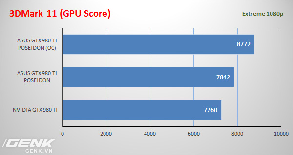 Đã có khá nhiều bài đánh giá chi tiết hiệu năng của GTX 980 Ti nên chúng tôi sẽ không lan man phần này nữa, chỉ bench điểm với 2 phần mềm cơ bản là 3DMark 11 và 3Dmark 2013, sau đó so sánh với các kết quả cũ.