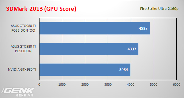 GTX 980 Ti Poseidon được hãng ép xung sẵn lên 1114/1753 MHz, so với mức 1000/1753 MHz của Nvidia. Hơi đáng tiếc vì Asus không ép sẵn xung nhớ, trong khi băng thông là một vấn đề của GTX 980 Ti nói chung. Khi chơi game, xung nhân boost lên 1329 MHz.