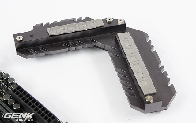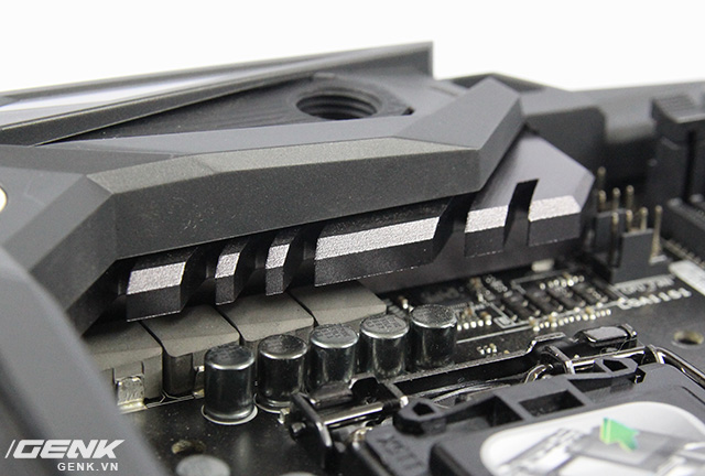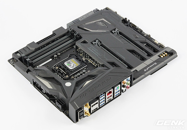 Thú thực, ban đầu mới cầm sản phẩm trên tay (chưa cắm điện lên đèn gì cả), tôi cảm thấy có chút gì đấy không ổn. Gần như toàn bộ diện tích bề mặt được bao bọc bởi một lớp giáp, khiến độ dày chiếc bo mạch chủ tăng lên rất nhiều, nhìn rất cứng cỏi.